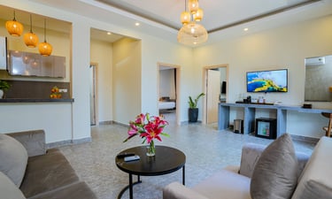 Designed with families in mind, the Deluxe Family room (60sqm+) offers the perfect balance of privacy and togetherness. This suite features a primary bedroom with a king-sized bed and a separate space with two twin beds or additional queen beds. With plenty of room to relax, two bathrooms, and garden or mountain views, it’s a true home away from home.