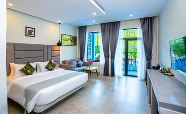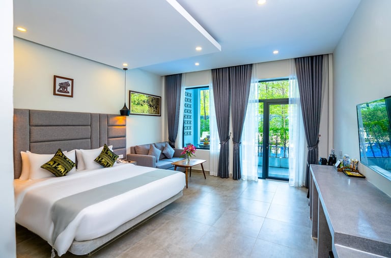 Our Deluxe King rooms blend modern elegance with the serene beauty of Kampot. Featuring a plush king-sized bed, high-quality linens, and a spacious work desk, these 40sqm rooms are designed for ultimate relaxation. Enjoy views of our lush gardens or the pool from your private balcony, and refresh in an en suite bathroom equipped with a signature rain shower.